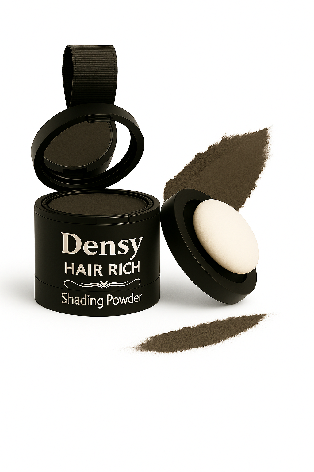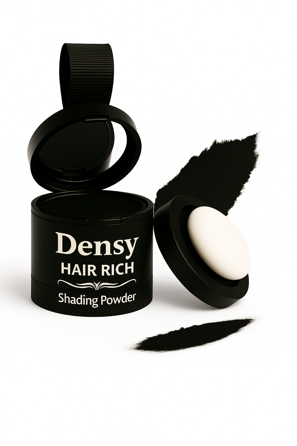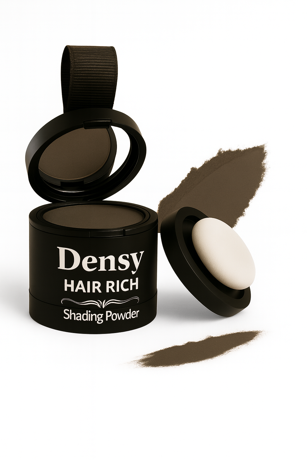 Instant hairline touch-ups. Densy is a clean, blendable hair-shading powder that fills thin areas and defines edges with a natural finish. Lasts all day, washes out with shampoo.