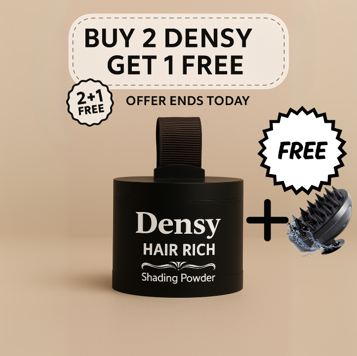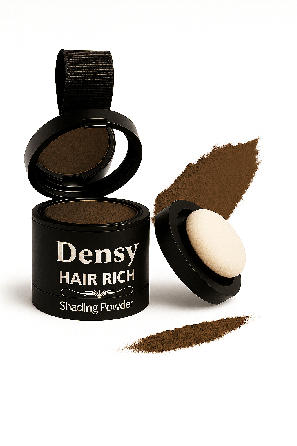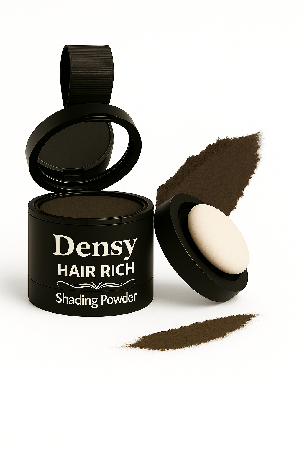 Instant hairline touch-ups. Densy is a clean, blendable hair-shading powder that fills thin areas and defines edges with a natural finish. Lasts all day, washes out with shampoo.